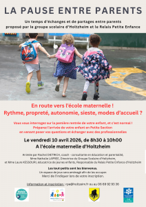 Afin de vous accompagner au mieux dans cette transition, le groupe scolaire de Holtzheim et le Relais Petite Enfance ont le plaisir de vous inviter à un temps d’échanges convivial entre parents et professionnels :